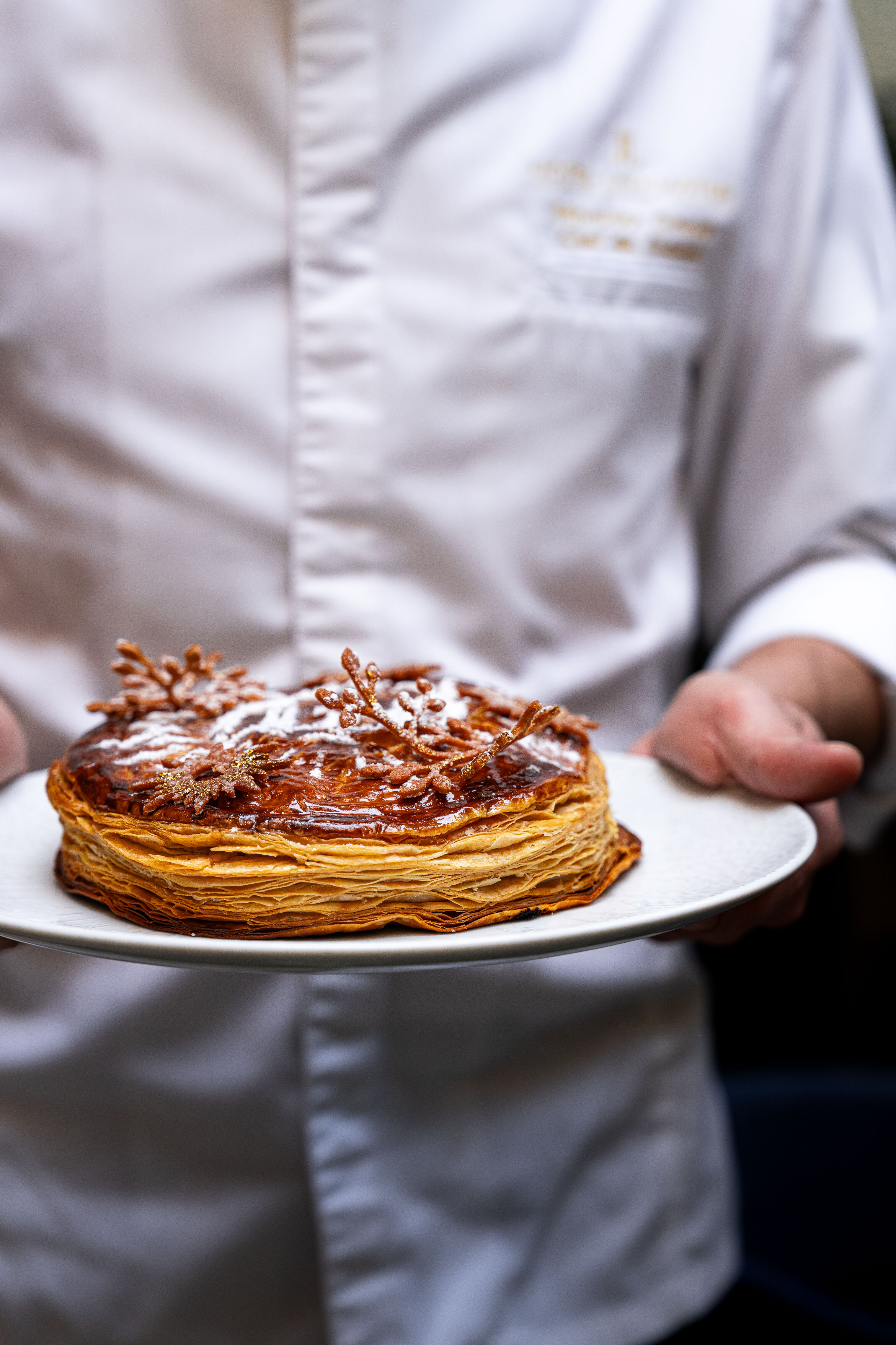 d’exception : La Galette Centenaire. Aux côtés du Chef Sébastien Giroud, les pâtissiers Maxime et Tom revisitent la galette des rois avec un feuilletage inversés aux notes de vanille. Un dessert qui raconte l’histoire d’un lieu iconique des Champs-Élysées 1925.